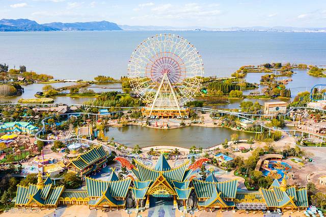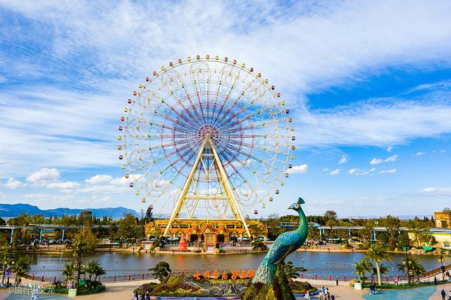 首先俯瞰游乐园,映入眼帘的就是巨型摩天轮,在摩天轮周围环绕着各种游乐设施。这个巨型摩天轮叫做“滇池之眼”,它是 云南 第一高摩天轮,在全球排前20名,“滇池之眼”高108米,可以同时乘坐336人。这个摩天轮也是以 云南 的代表性动物“孔雀”来进行主题元素的打造。我们乘坐摩天轮,可以欣赏到周围美丽的滇池风光欢乐世界的项目全貌。而这个坐落在滇池旁的“滇池之眼”就如同美丽的少女的秋水盈盈的双眸,静静地俯瞰着美丽的滇池风光。