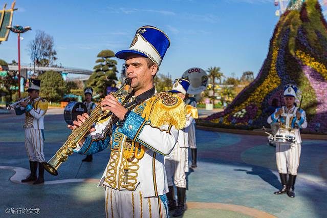 在广场上,有乐队在演奏着活泼的乐曲。他们穿着鲜艳统一的演出服装,脸上洋溢着快乐的笑容,游客们可以听到他们现场演奏的音乐。在广场上表演的还有卡通和动物人形玩偶,他们跟随者音乐的节奏跳着舞,与游客亲密地互动,看到那轻松欢快的舞蹈,仿佛所有疲惫都消除了,也想参与欢快的舞蹈和音乐中去。
