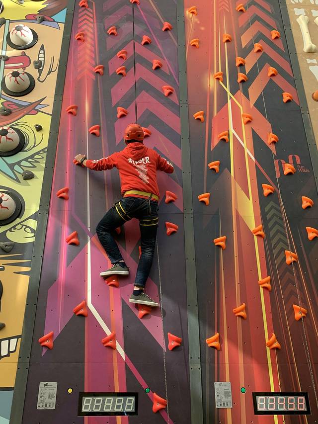 我更愿意体验的还是攀岩,之前是看到别人的精彩,亲自体验感受还真不一样,没爬几步,手臂的力量仿佛已不行了,到一定高度更害怕如何下落,虽然教练很轻松地指导如何潇洒的下落还是战战兢兢地狼狈地坐在了地上。