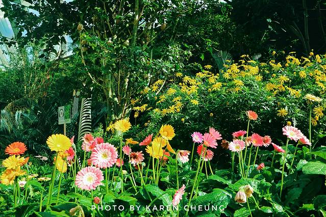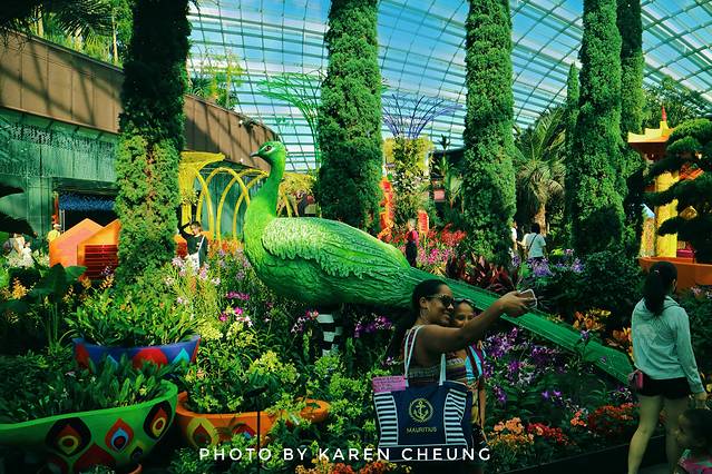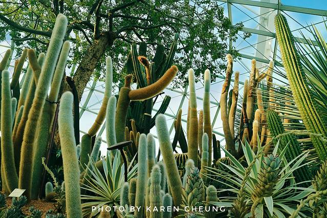 花穹主要展示地中海和亚热带地区的鲜花和绿植,可以看到不同地区的代表性植物。里面有9个不同的区域:猴面包树区域、肉质植物花园、澳大利亚 花园、南非花园、南美花园、加州花园、地中海 花园、橄榄林以及花圃。花圃区域会不定期举办特色花卉展, 比如碰巧遇上的这个牛车水文化展……