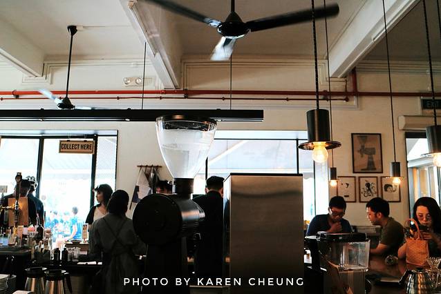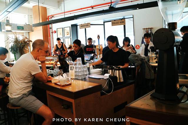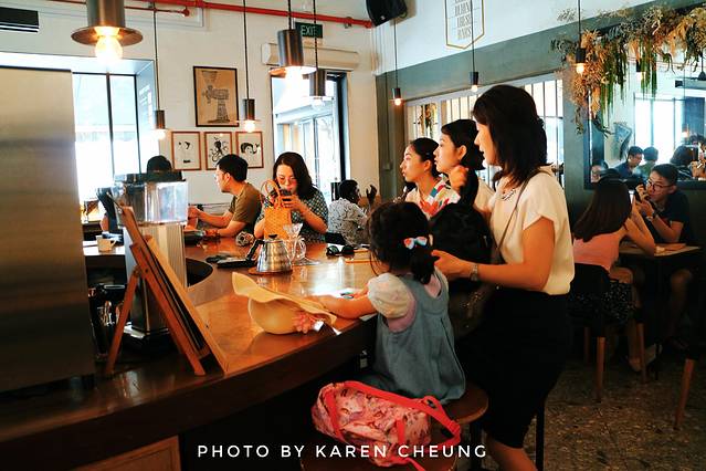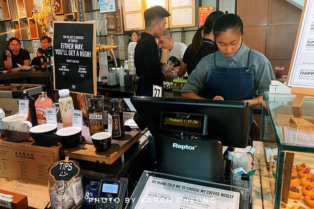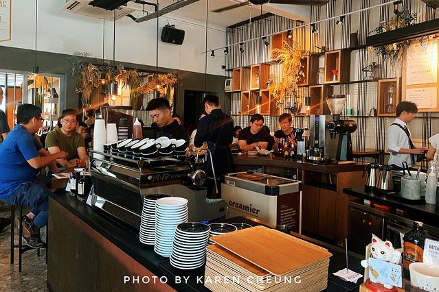进入室内区域,却是工业风十足。暖黄色旧吊灯,老式复古吊扇,360度视角的咖啡环状吧台。顶部的钢梁,被改造成一个巨大的货架。吧台及桌椅都是复古的木质元素,连餐单都是做成“旧报纸”的感觉。除了供应特色手冲咖啡,还有各类简餐小食,甜品烘焙。整个咖啡店,浓浓的小资氛围,低调复古的南洋风情。