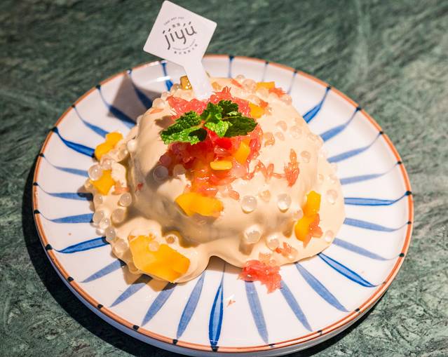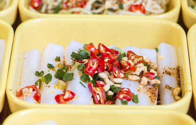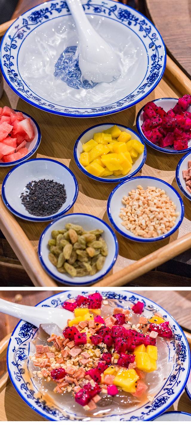 有趣的是桌台可以旋转,将小碗菜放上一圈,一边转桌台一边拍视频,发圈效果很好看。吃完之后来一份冰粉,七种配料加在一起,颜值高到舍不得吃~