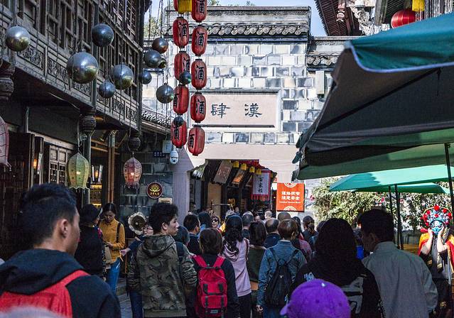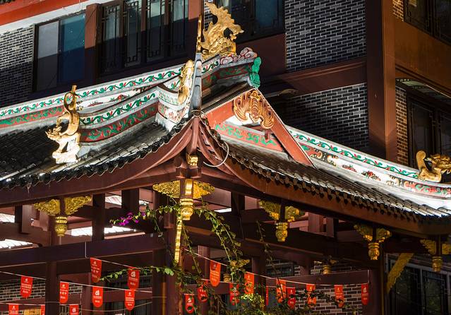 如今的锦里,当然没有了秦汉三国时期的建筑,整个街道以明清民宅为主体,配以三国文化(武侯祠)、四川民俗(川剧表演)、特色文化(铜人、变脸),打造出了一条综合类型的特色旅游街区。整个锦里有许多适合拍照打卡的地方,趁着这几天阳光正好也拍了不少的照片~