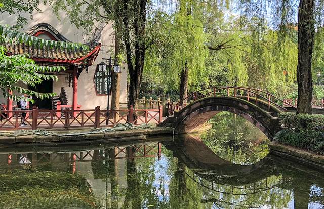 从百花潭公园继续往西走,就是大名鼎鼎的【杜甫草堂】,作为成都第一梯队热门旅游景区,想必大家都已经去过、了解过里面的情况,所以这次我也没有进杜甫草堂,而是绕了半圈走到杜甫草堂背后,打卡了当年杜甫流落成都时真正留下文化遗产的地方,也是成都市区唯一评上“五星级公园”的地方【浣花溪】