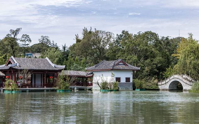 公园引入了南河的河水,在园内挖出了大大小小数个水池,每一个水池旁边又修建了阁楼、石桥等建筑,打造出了一连串的观景点。