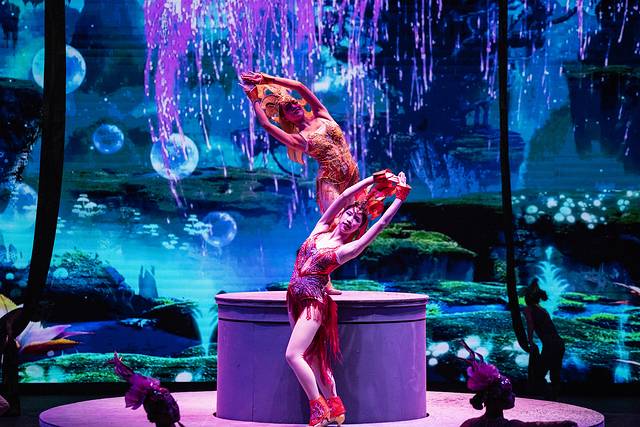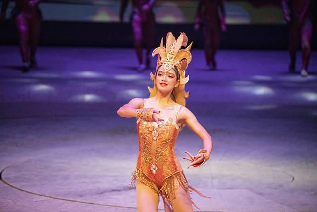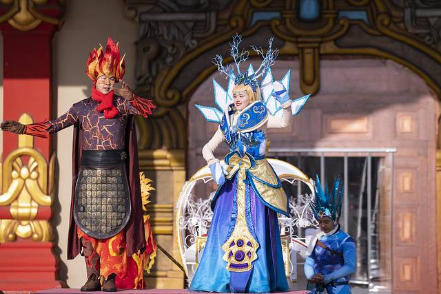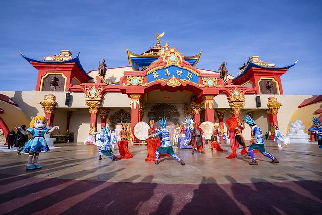 第二天睡到自然醒,在酒店吃了早饭,刚好10点赶到舞马世界的大门口观看开园仪式——这个仪式载歌载舞,讲述了一个冰国和火族爱恨交织的故事……哈哈,外国的演员小姐姐很漂亮的哦!