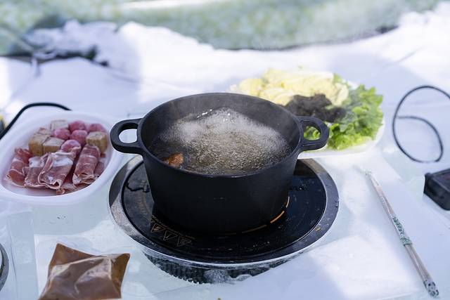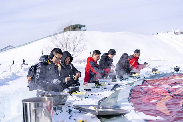 中午的开胃菜是户外冰火锅!这可是货真价实的“冰”火锅哦!电炉子直接放在巨大的火锅冰雕上,盛肉片素菜的盘子就搁在冰块上,揭开盖子热气腾腾,倒上麻酱就开始饕餮吧!这般奇妙的体验价钱也不贵,一荤一素只需要30元。