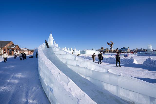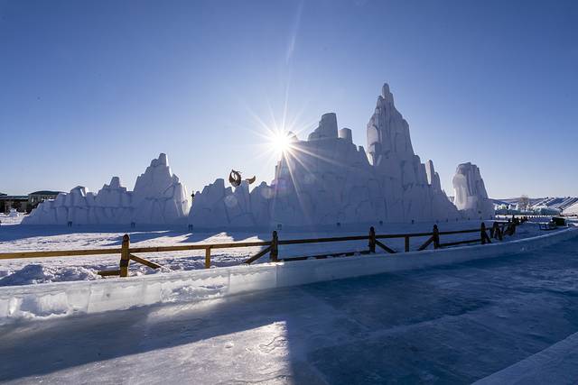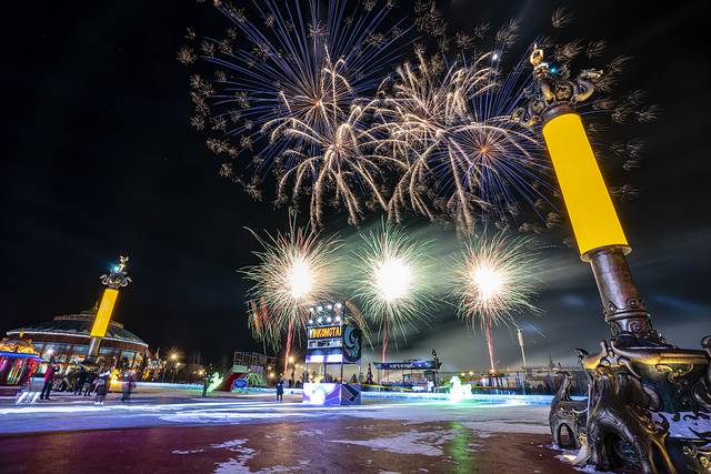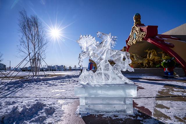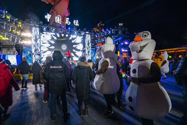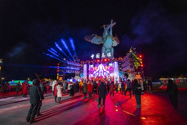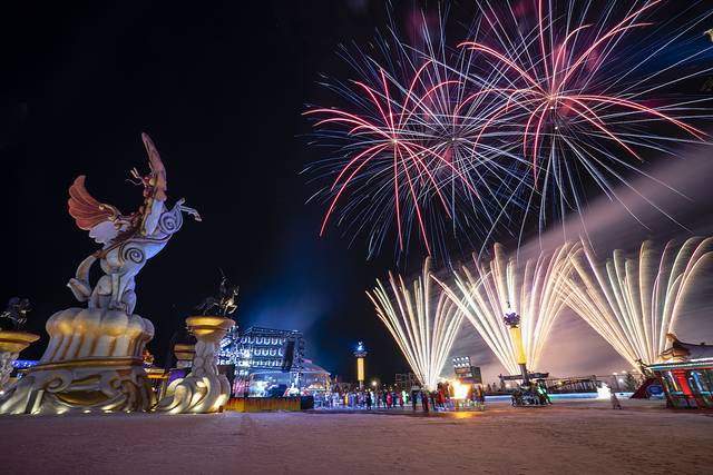 晚上会不会无聊呢?当然不会啦!夜幕四合,中国马镇的舞马世界灯火璀璨,激情的电音狂欢,来自俄罗斯的DJ、MC激情四射,非洲肯尼亚的舞者纵情舞蹈,让零下20℃的空气也被点燃!大家围着舞台载歌载舞,而这时,漫天的焰火升起,沉沉的夜空顿时被涂抹上了姹紫嫣红的颜色,地面的冰雕与天空的烟火相映成趣,这是草原上的冰与火之歌!