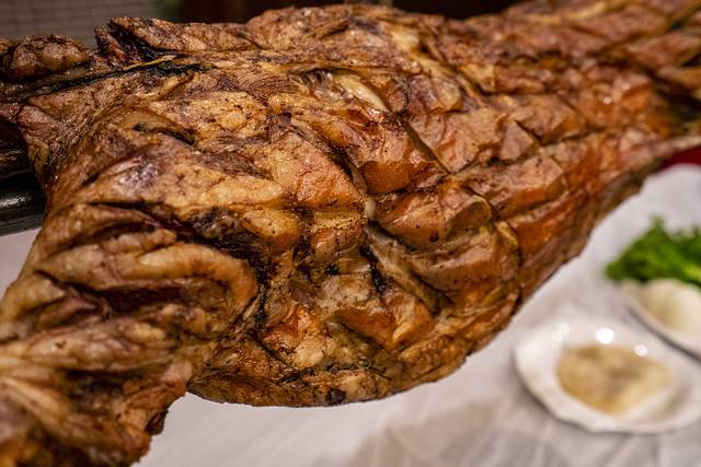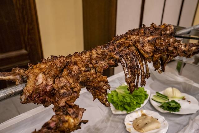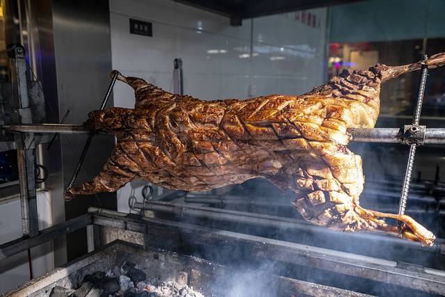 在中国马镇的烤全羊是鲜羊现烤,中国马镇的烤羊可是自有一套吃法——讲究的是“六吃”,一吃皮,二吃肉,三吃羊排,四吃羊腿,五吃肉串,六喝汤。从羊皮开始,羊肉、羊骨、羊肉串、羊汤,层层递进。穿在架子上的烤羊也需要进进出出数次,逐次加工。每吃一道,食客们都要戴上一次性手套,围着烤羊手撕而下,其乐融融颇为热闹。不过能全程吃完六道的,应该都是大胃王了。