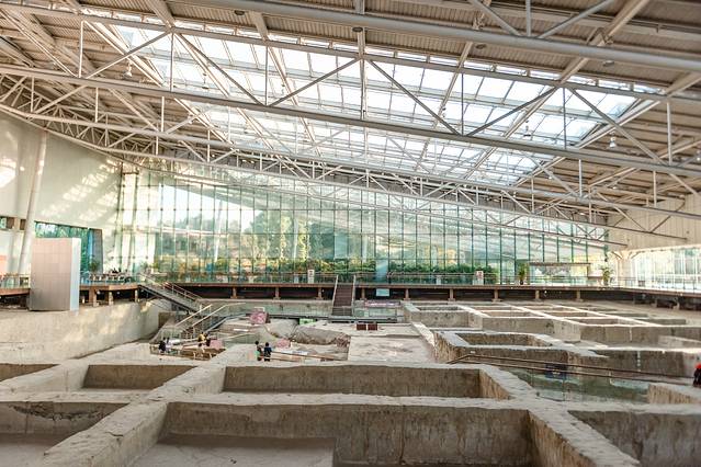 一进门有各种坑洞,就是金沙遗址,这里发现了很多上古时代遗留下来的象牙、玉器等等。现在也能看到一些动物遗骸、象牙白骨。