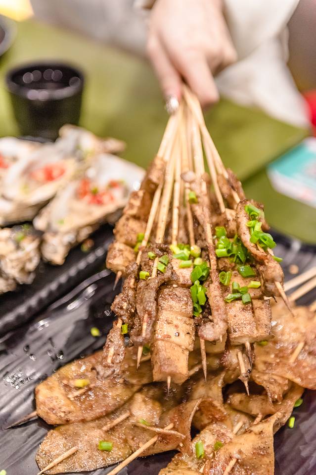 吃饱喝足后,再点一盘烧烤,本来我们几个女生已经吃的差不多了,但烧烤闻着太香了,经不住诱惑又点了烧烤。撸撸串,巴适的板!绿色的葱花洒在肉上,看起来非常诱人。无论是什么季节都适合吃烧烤,这家的味道非常不错,把握的刚刚好。