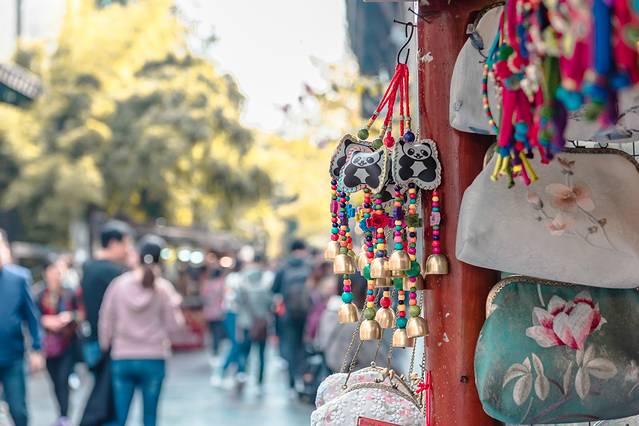 这条街上能看到许多只属于成都的元素,挂有可爱的大熊猫图案的幡铃、刺有蜀绣的小荷包等等,都非常的有特色,很适合带回去做小礼物。