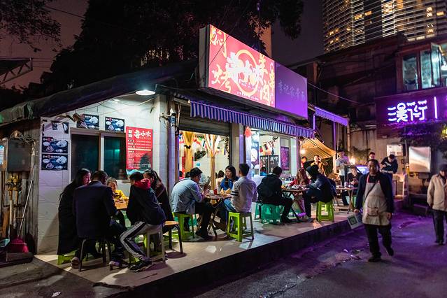 顾客们就这样三三俩俩的坐在街边,左手拿着串,右手拎着酒,豪爽恣意。我们不禁被感染,肚子也咕咕叫起来,索性走进去。