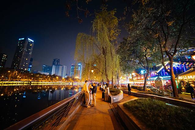 放下白天匆忙与紧张,沿着府南河漫步,慢慢走到九眼桥附近,夜生活开始了。