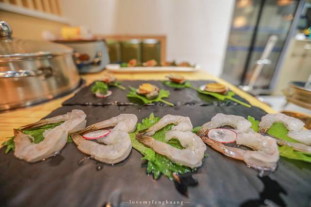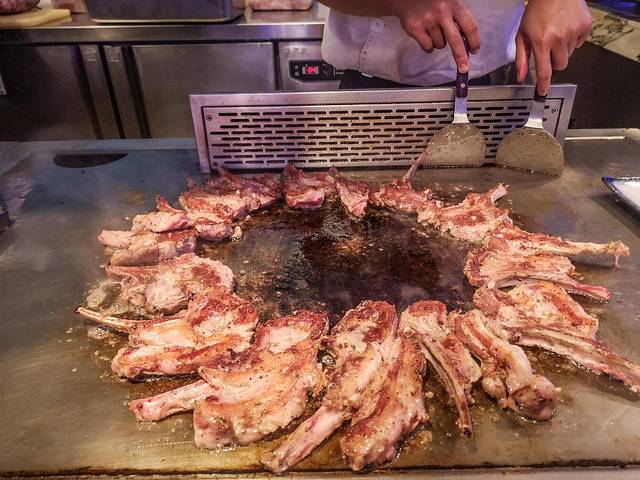 他家的牛排和羊腿在铁板上现做,肉特别的嫩,一定要搭配黑胡椒酱趁热来吃,很美味,我最爱吃的黄牛侯,已经腌的入味的辣肉片,酱香味的嫩肉片,蟹柳,老豆腐,午餐肉,鸭血,竟然还有最爱的秋葵,而且是一整个的秋葵,芋头片,养生又健康,比起其他海鲜自助,这里不会因为是海鲜自助,而忽视其他的诸如烧烤,日料,热菜,蔬菜水果饮料的配比