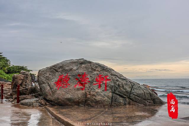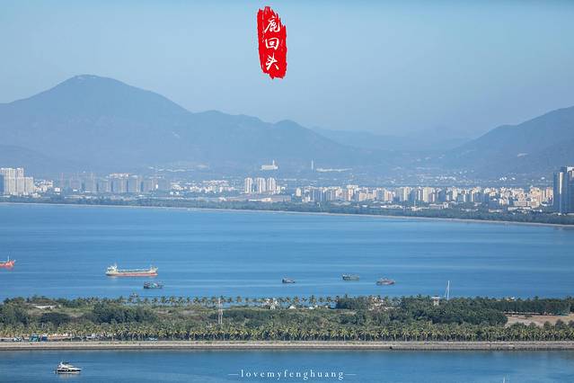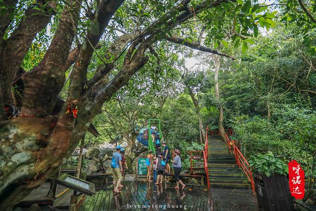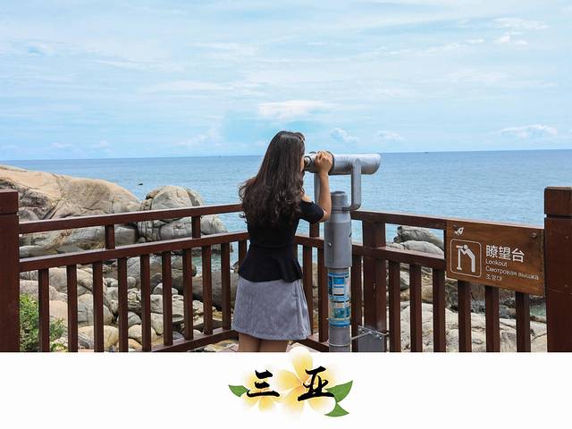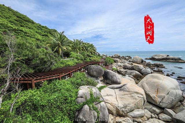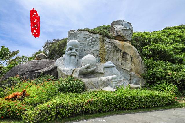 大概二三十分钟的时间,爬到一处观景平台,能清晰看到凤凰岛的全景,除了一览无遗的自然风光,景区还打造了多处人文拍照点,“爱”字摩崖石刻、 “永结同心”台、“连心锁”、“夫妻树”、“仙鹿树”、“海枯不烂石”、“月老”雕像、“爱心永恒”石刻等等,都是与爱情有关的元素,而且每年天涯海角国际婚庆节期间,情侣们必定会来到这里海誓山盟,情定终生,希望这座承载无数幸福的山,也能带给每一个登山来此的游人好运、好姻缘。