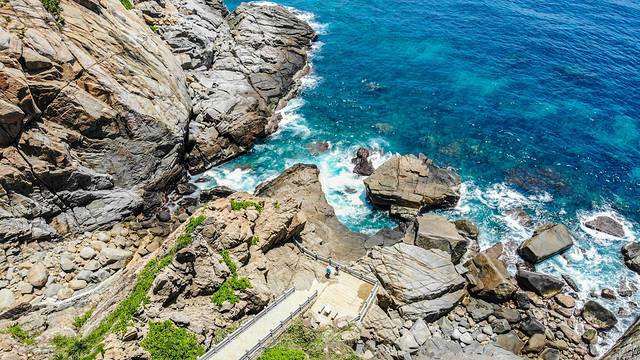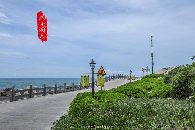 从 大小洞天 到小月湾之间的沿海栈道,一个接一个的摩崖石刻,形象逼真的石头被世人赋予了生动形象的典故,两块巨石叠加着,常年的海水侵蚀,下面只有3个很小的支撑点,看上去摇摇晃晃,但实际上却纹丝不动,千年不倒。