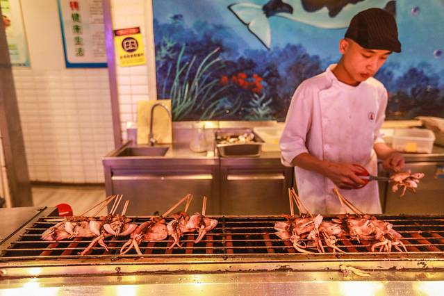 每一个海鲜上都会立个小牌子,不但标注了海鲜的名称,更把每一种海鲜需要蒸煮得时间标注上来喜欢烧烤的还有鱿鱼比目鱼三文鱼,生蚝,以及各种烤熟的肉串。酥皮海鲜汤,为确保汤的品质,现烤现出,每半小时烤制一轮门外贝壳珍 珠海 浪的造景,走进餐厅,以为走进了一个水族馆 ,先给人视觉上美的享受,只有在 广西 能吃到的沙包螺,这里也有,还有包子螺,海白螺,切片螺肉等好几种螺。