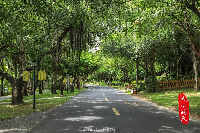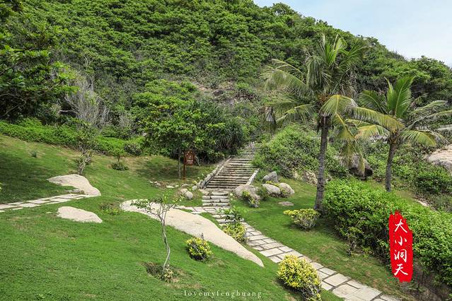 三亚 有15公里的椰梦长廊,在 大小洞天 刚入口处也有这样一段“小椰梦长廊”,高高的椰子树上,挂满了青黄不一的果实,它与银色的沙滩,蓝色的大海,组合成一幅色彩斑斓的长卷画图,举目远眺,海阔天空,碧波万顷,不远处的领海基点塔坚如 磐石 ,守卫着祖国的 南海 。