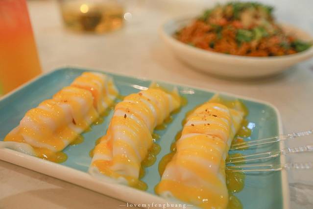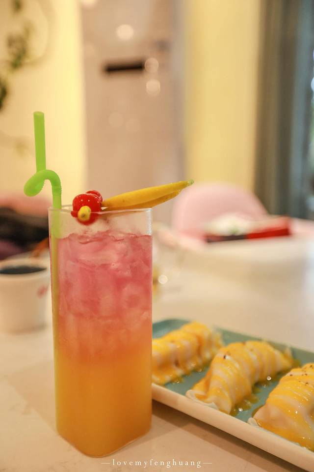 梦幻紫罗兰,清爽的热带糖果色,喝起来也是特别的酷爽,搭配桂花芒果卷,作为餐前甜点,开胃又解暑,芒果卷也是特别的赞,里面包裹的都是一大块一大块的芒果肉,虽然是一道餐,但其实是一道水果菜。