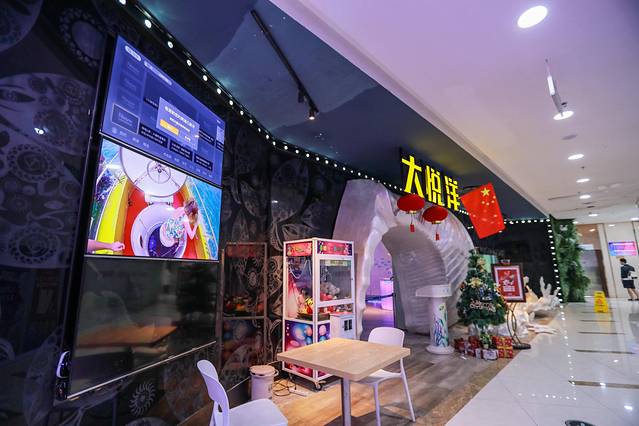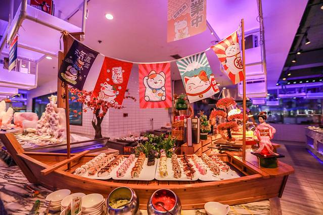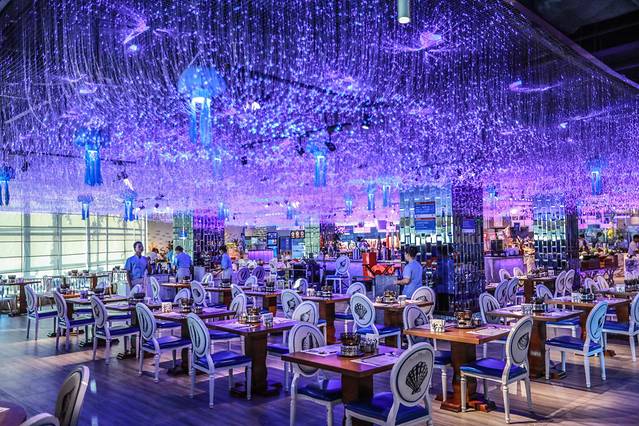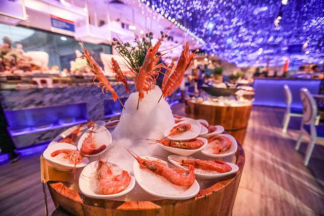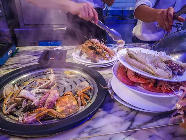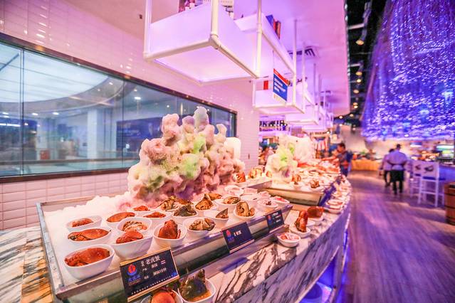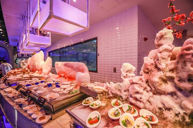 来到大悦洋海鲜自助餐厅,从外观就被巨大的贝壳造型吸引,走进去更像是走进了一个水族馆,餐厅内分为海鲜区、刺身区、寿司区、铁板区等等。