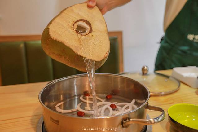 点了一份木瓜竹荪椰子鸡,锅内已经倒入了2个椰子的椰子水,趁着冷水要把木瓜和竹荪都下锅,然后再倒入第三个椰子水,木瓜营养丰富,尤其对于熬汤,多喝更加滋养身体。