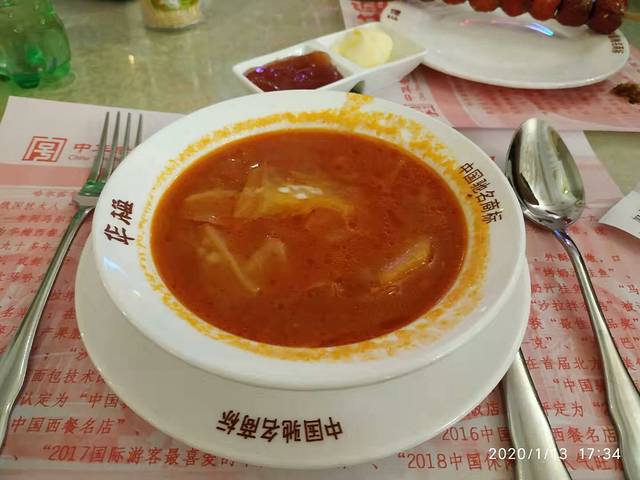 很著名的80年代建筑的华梅鹅餐。也是在中央大街上,不用排队进去直上2楼,环境真的来说非常的一般,就像是吃快餐一样很简陋。价格不简陋,我们吃了著名的面包套餐,也就是多了一小碟草莓酱和黄油。一碗红菜汤就是番茄酱泡白菜汤。虾罐是唯一可圈可点的,40块钱里面都是那种像是用面粉炸又没有炸熟的虾子。还点了网上大力推荐的烤奶汁炸板。这是最垃圾的,68块钱里头就是芝士局两三片香肠。