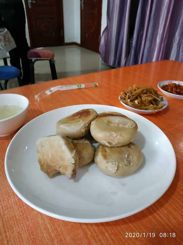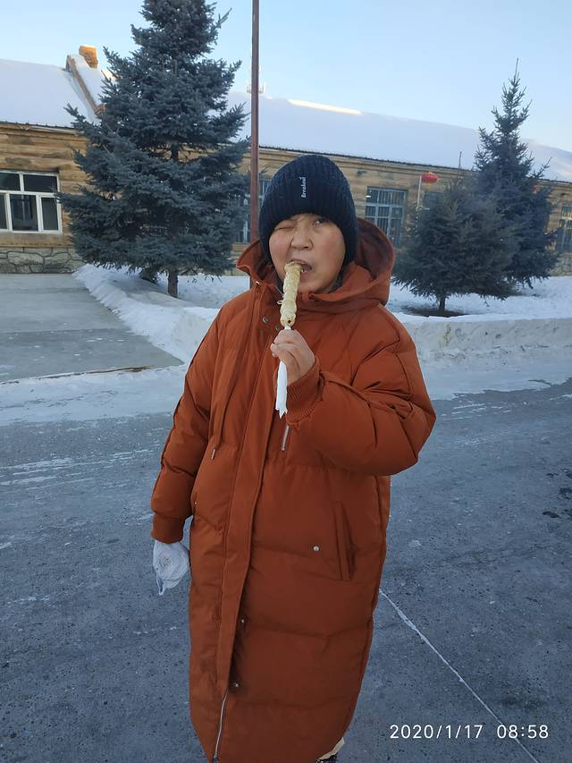 又开始看大众点评上面推荐,这里有一个叫做捏豆包。是他们漠河很有名的小吃,之前在北极村没吃到,我心心念念一直想吃两块钱一个,他让我们一次性买了一袋10块钱9个。一种说不出来的味儿,妈妈来形容一下。腻歪就是糯米做的那种。多吃一个要吐。