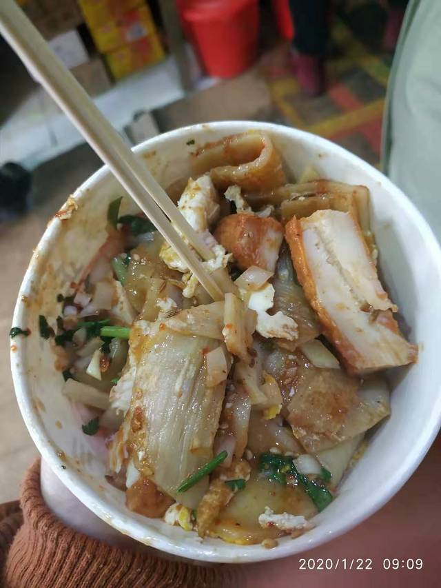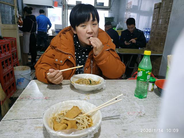 于是我们就开始过早了,选择了一家红砖街旁边的安徽板面里面有很多当地人和开出租车的人进来,我们进去眼睛依旧全都是雾。缓了好大一股劲,妈妈问里面的人说有菜单吗?他们说没有,只有一种面就是板面,小份的是7块,大份的是8块,妈妈本来想要一个大份给我住址了,就点了一个小份的。实在是量多,我们还要了一个杆子,以为是会像我们这里小小一片,结果他们这里是千张,一大卷千张还要了一个圆子。