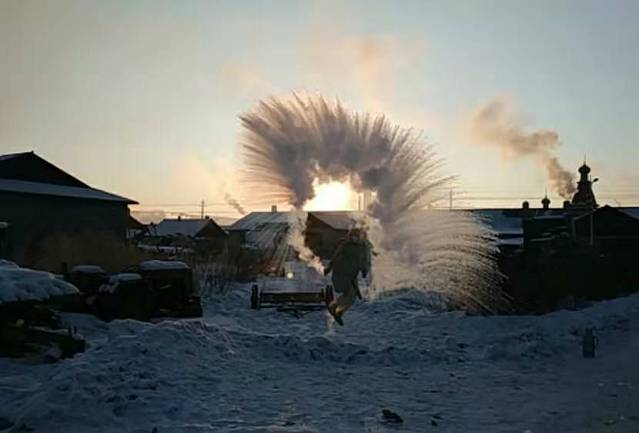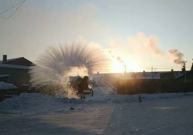 今天早上一定要早早起床,因为整个在北红村和北极村都没有一次像样的泼水成冰,而明天早上我们就要离开这里了,就不能再进行泼水成冰了,起得很早吧,八点多钟九点多钟。这里的温度依旧是负36度电阻,这个放在客厅里的水,我们一共用了两瓶,泼水的时候时不时都有马耙里经过。