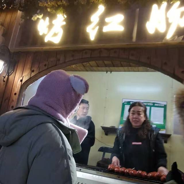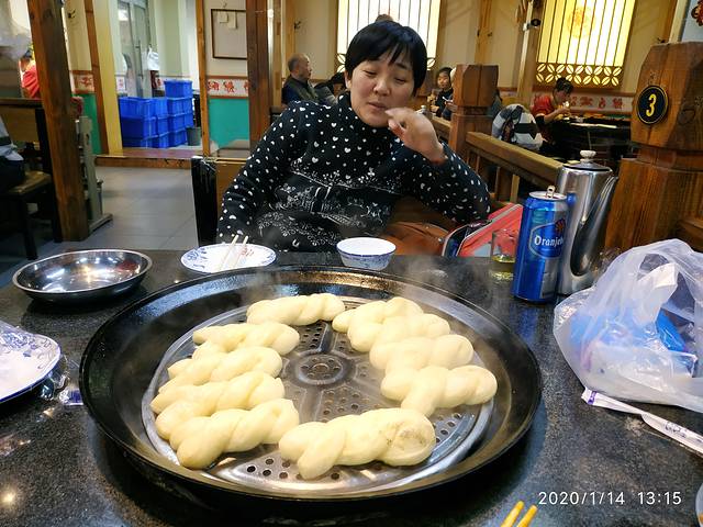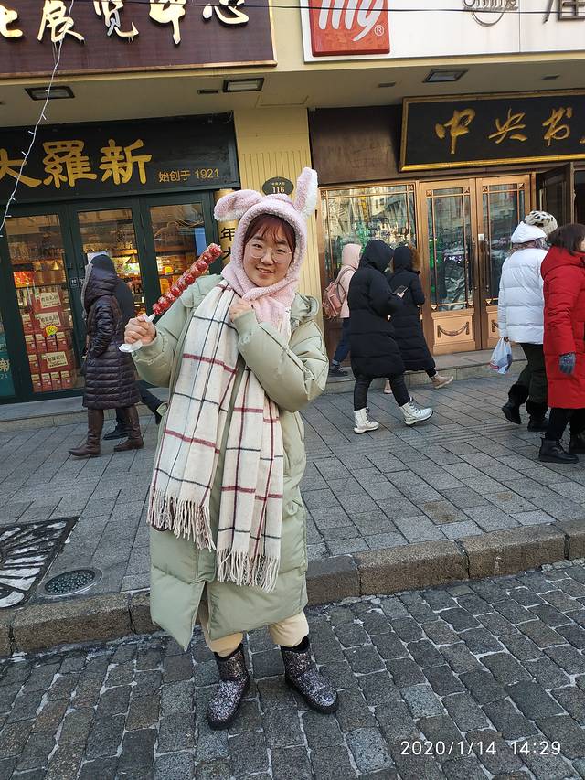 今天准备去逛冰雪大世界,出发之前我们在大众搜了一下,吃这里最有名的煎饼。步行走了几条街来到了这个煎饼店。推开门进去差点没把我妈给熏倒,没有排风扇没有透气,窗里面的油烟他实在受不住也没有坐的地方,洋葱在旁边切的熏着我妈的眼泪直往下掉,实在没办法,但是也只有陪着我吃,因为外面也不能边走边吃。