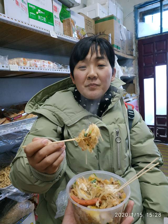 到了吃饭的点我们用大众,漠河县排名第一的春雪大骨面。他的门面不起眼,旁边就是修鞋的,我妈还以为环境不好呢,说旁边就是修鞋子的。推开门哇,里面都是坐的人。来一碗大碗面12元。又点了几个炝菜。吃饭的人不是一般的多,面是很大的,但是我没有觉得有多好吃。卡淡无味说是骨汤鲜美,但是我们吃不出来好吧,但是在这么冷的天里,能吃上这一碗热乎乎的面也是不错的。吃完面稍作休整,我们就拖着行李箱去了市场。一路上有很多的人给我们发名片,要我买一些漠河的特产,漠河的人还是非常非常的热情的,在市场里我们买了一些必需品去北红村,我因为听人说北红村是一个非常原始的村庄,怕里面什么也没有,就带点东西过去。