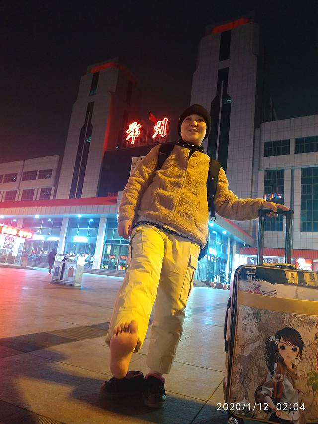 到达郑州站是12号的早上2:00,车子上坐我们隔壁左右的东站这一站下车了,站门口特别多的人,因为在这车上实在是受不了了,妈妈激动的把袜子脱了,光着脚丫在火车站门口拍下了这张照片。