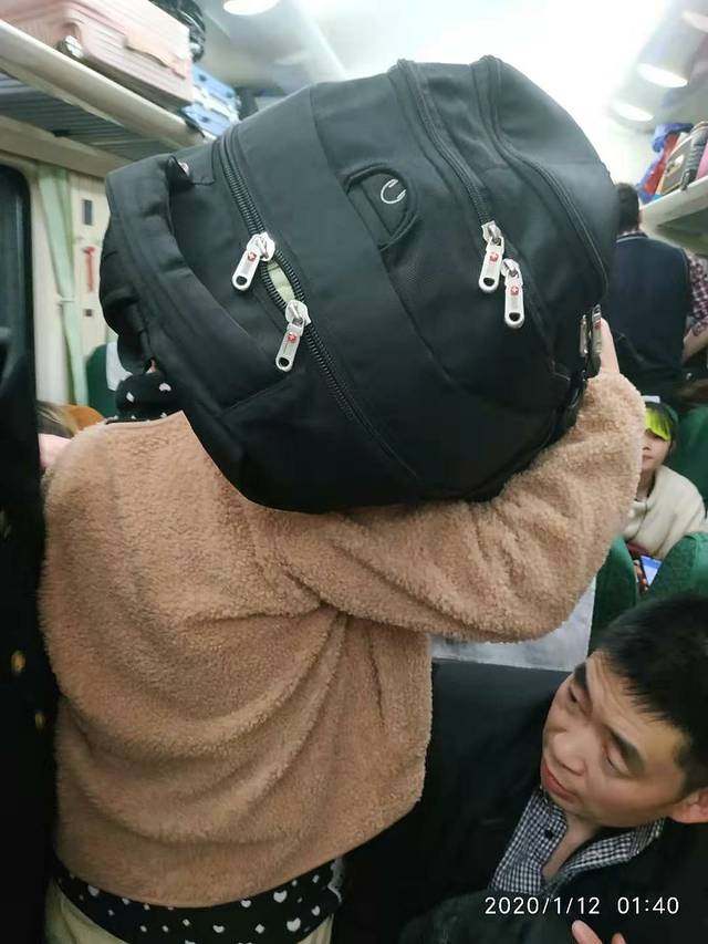 我的妈妈是大力。扛着一个包,两个车厢来回串东。