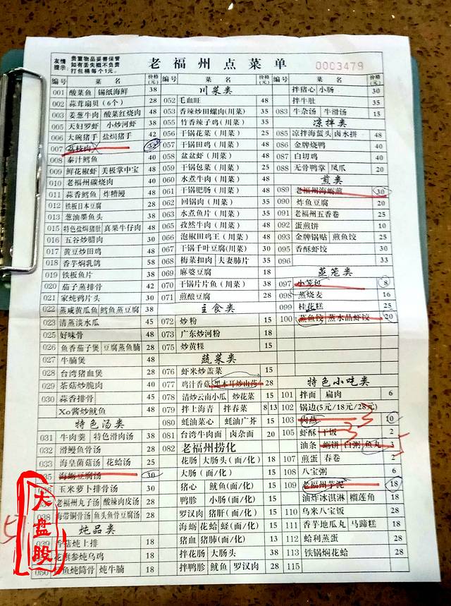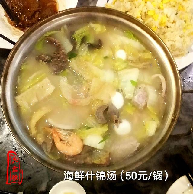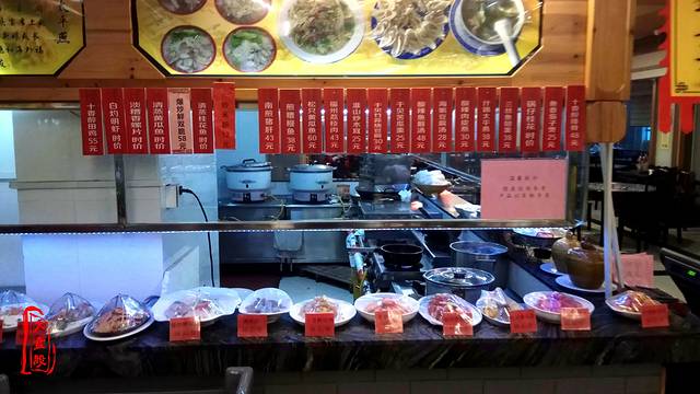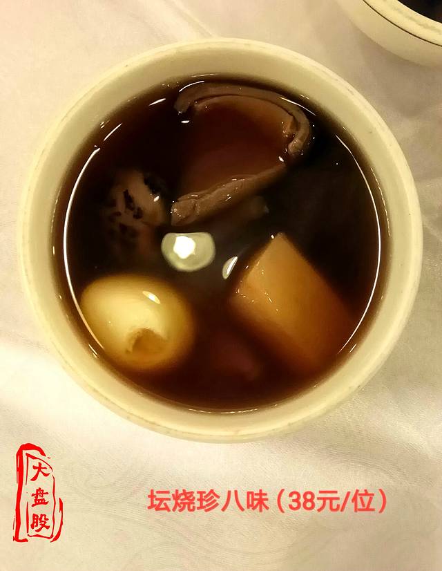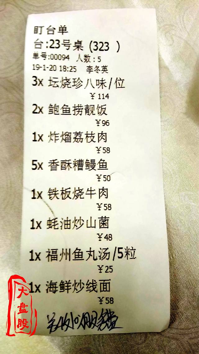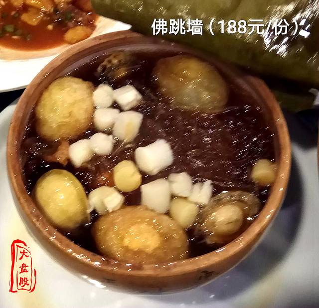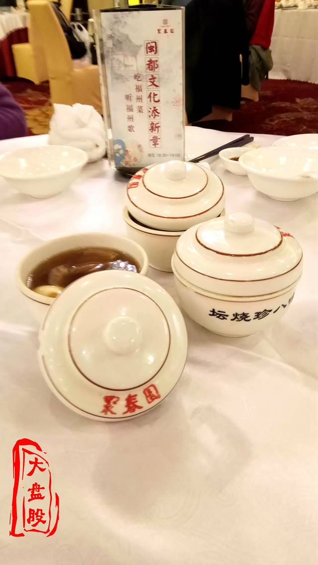 在宾馆休息到晚上五点,中午的小吃也消化了差不多了,准备去吃一顿正宗的福州大餐,网上查到的老福州徐记(东百店)就在东街口东百大厦11楼,一家人直奔那里,直达电梯只到10楼,再乘自动扶梯上天台,穿过天台才找到,结果发现它是类似于上海大食代似的大排档,它能有好厨师烹饪吗?我们犹豫了!正好通过天台看到聚春园大大的招牌,全家临时决定就去聚春园吧!通过地铁地下通道,来到了聚春园。聚春园是福州名菜《佛跳墙》的发源地,本应该各项都出类拔萃,但体验感觉却大相径庭。点菜环节就是一拖再拖,从坐下到开始点菜,足足让我们等了半个小时,以后上菜慢不说了,最后一个海鲜炒面线又让我们等了半小时。基本没服务却还要收取10%的服务费,难道老字号就是这样吃老本的吗?