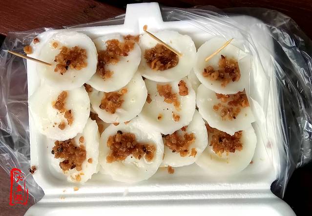 我预定的汉庭酒店(潮州古城店)就在1公里左右,到达酒店安顿好,已经11点多了,出门觅食,朝着潮州西湖方向搜索,出门看见一个卖咸水粿的摊位有当地人排队,味道应该错不了,8元/32个,买了一份分食了,咸的是萝卜干,味道还行。