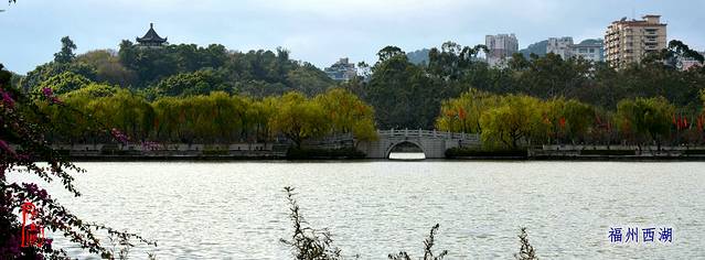 三坊七巷并不是很大,一圈逛下来三个多小时,才两点多一点,早上出酒店时看到福州西湖离酒店才700多米,决定去逛一下吧,一家人原路返回,沿着达明路美食街走到底左转就到了。西湖公园挺大的,老人不想走进去了,我们就在外围走了一圈,回宾馆让老人休息一下。