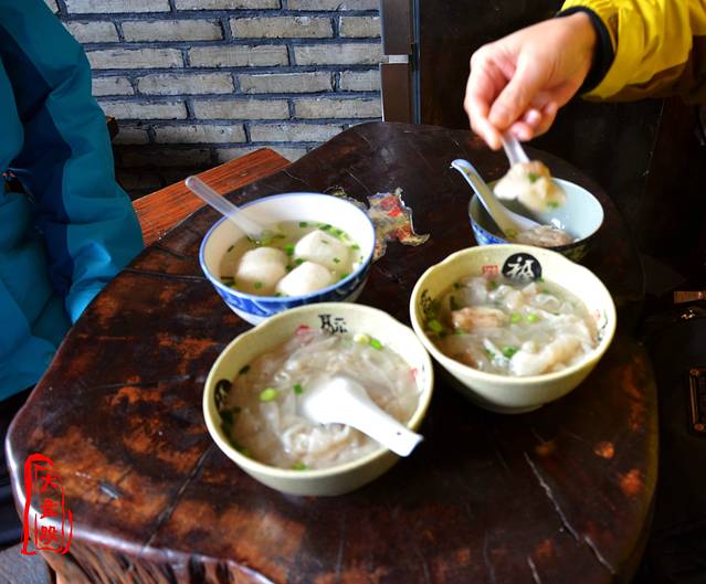 第一家就是同利肉燕老铺。点了肉燕(15元/碗),燕丝(15元/碗),鱼丸(15元/碗),同利肉燕名不虚传,燕皮滑润,燕馅鲜美。燕丝就是燕皮切丝,非常滑润。看着是红薯粉制作的,其实也是牛肉制成的。具体在《舌尖上的中国》有详细的介绍。手工鱼丸非常Q弹,有鱼的鲜味。这个价格具有很高的性价比了。