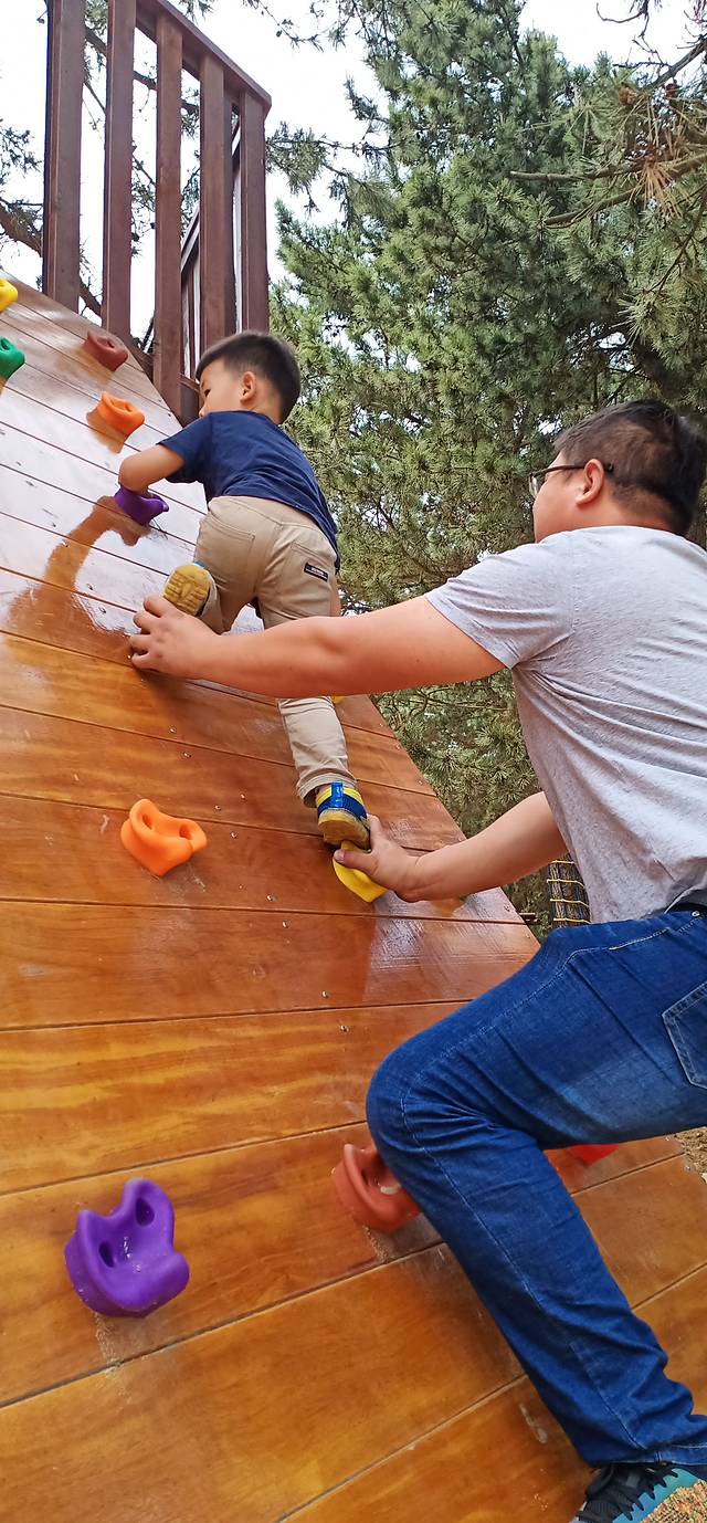 我们的第三站便是网红小火车。真不愧是网红小火车排队的人好多呀!小火车出发啦~小火车经过的第一站便是恐龙乐园。据说有54个1比1的仿真恐龙组成。哇,映入眼帘的恐龙都好高大呀!靠近恐龙的时候,恐龙会动还会发出声音~好逼真呢!恐龙乐园过后,便是丛林穿越,一个高空挑战项目。由于全程上去了就下不来了,所以没让儿子进行挑战。火车经过的北面是一个木头人形状的滑梯和一个由轮胎组成的恐龙模型,好有创意呀!南面是一些大型的积木场所和一个别致的攀爬小树屋~