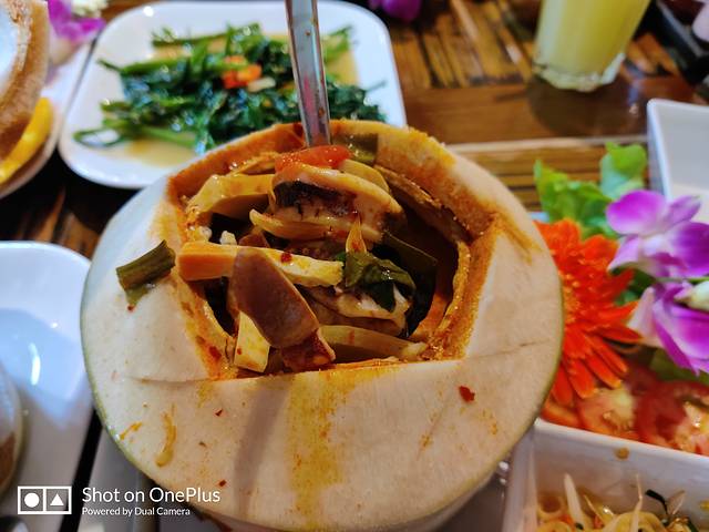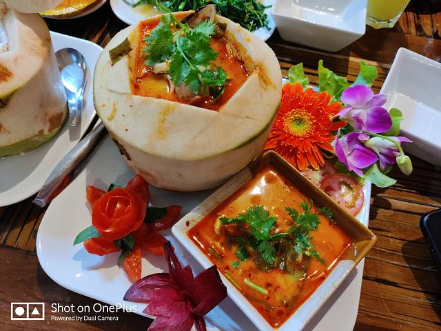 【椰子冬阴功汤】可以选不同的配料,有虾有蔬菜之类的,选了最贵的海鲜,也就50块不到,超多料,还配了一碗纯汤,不够可以自己加,味道适中,酸辣刚好,很香浓,里面还有椰子肉,比普通的冬阴功汤多了一层清香