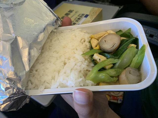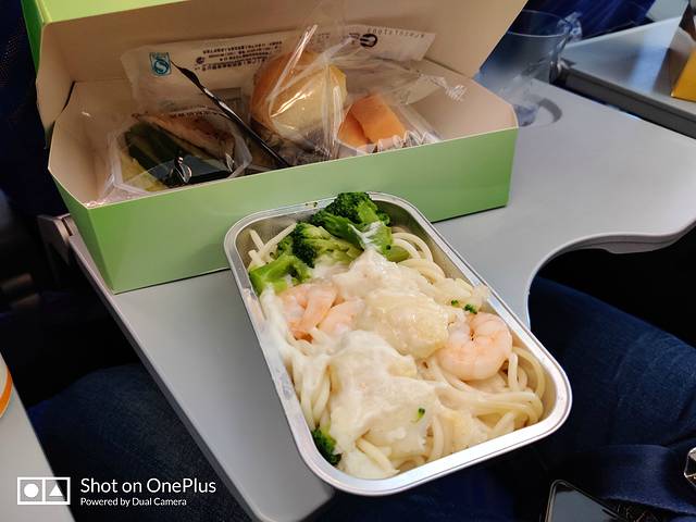 男友选了海鲜餐,这个真心不错,在南航餐食里面算很好了,芝士意粉还有虾,都挺好吃,还有水果,各种配餐小吃。