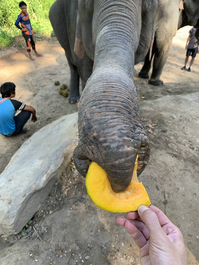 一开始先喂大象,有切好的瓜,胆小可以先拿大的喂,大象用鼻子吸住,卷进嘴里,胆大的可以直接喂进嘴里,导游说大象要不停吃东西,喂多多都可以,可以摸鼻子,但是不要摸头,会以为你要攻击它。