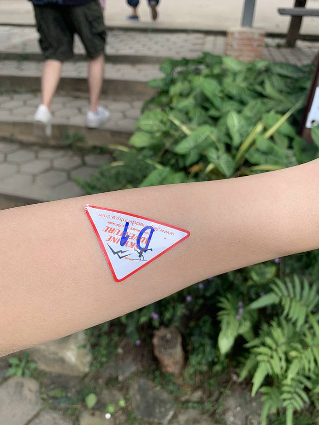 存好东西就要穿装备,基本上什么都不能带,除非是有拉链的小包腰包挂脖子的手机套,或者有拉链的衣服装随身物品也可以,反正手不能抓着,飞的过程中肯定会掉,也没有人可以帮你拿,鞋子必须穿不会掉的,最好穿运动鞋,因为还要走路过木桥,穿好装备会有一个小背包给你,里面有一瓶水和一个小蛋糕。