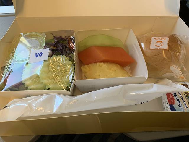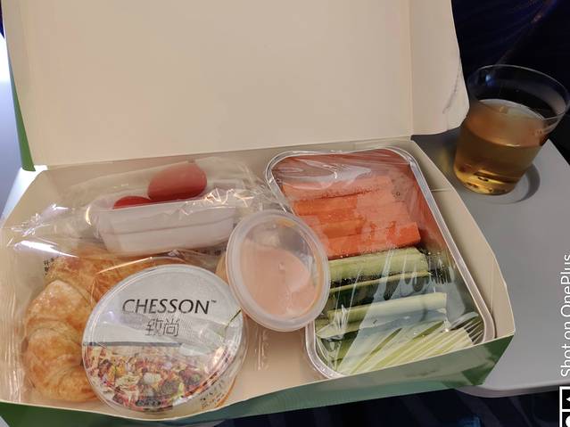 去程我选了蔬果餐,有各种蔬菜和水果,还有牛角包酸奶。
