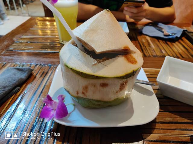 【椰子汁】一整个椰子,肉是软的,特别给了不锈钢勺子可以舀来吃,很清甜的水,很浓椰子味,超多水