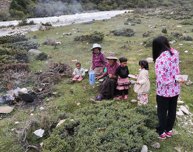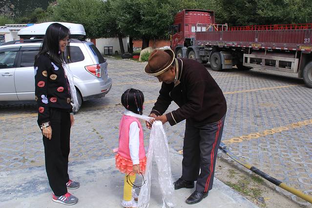 偶遇沿途五体投地一步步朝拜到拉萨的一家藏族人,小娃跟藏族小朋友分享文具和零食(在出发前就准备好50套文具),让孩子学会分享。