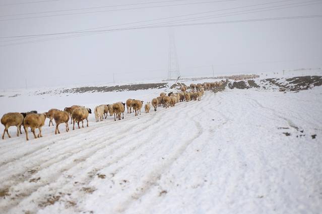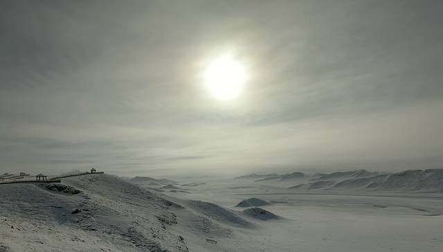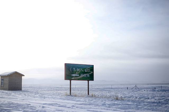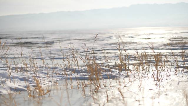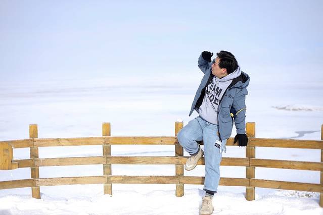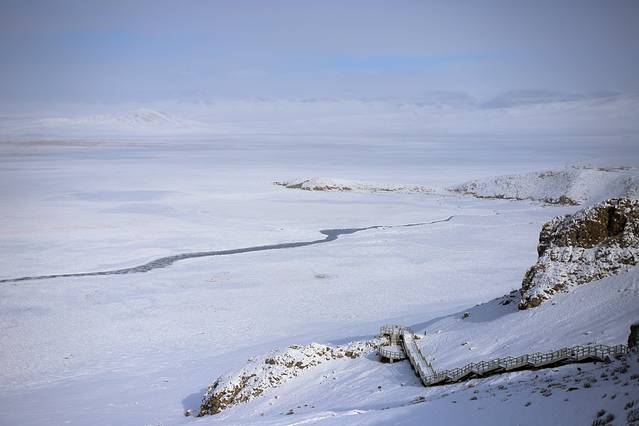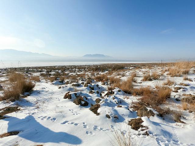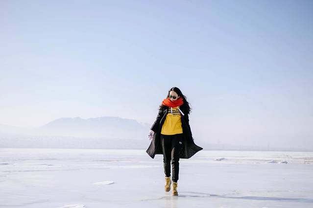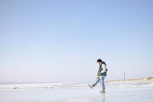进去湖中心要走过一片盐碱地,路有点难走,松软的冰雪夹杂着泥土,只能沿着脚印左踩右踏的,走了大概15分钟,到了湖的外围。
