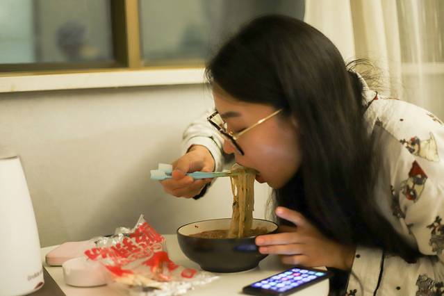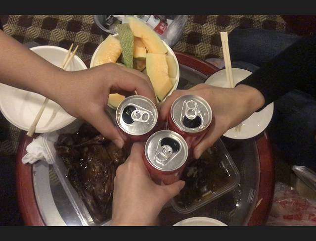 饿了好久的我们终于吃上一顿好的年夜饭,电视机上还放着春节联欢晚会,年味浓浓。