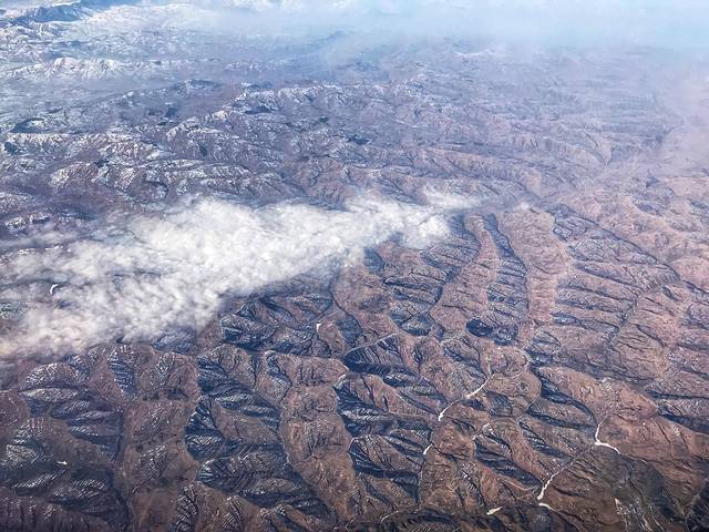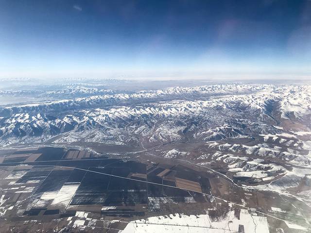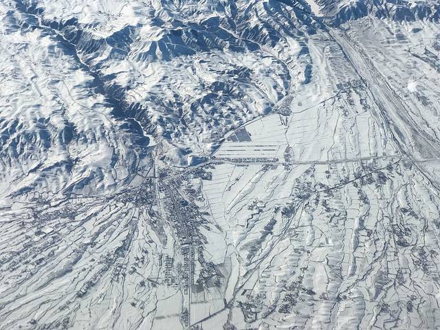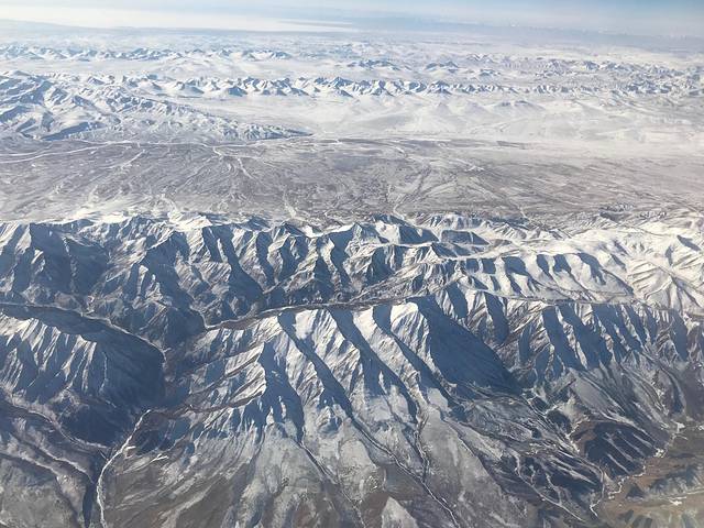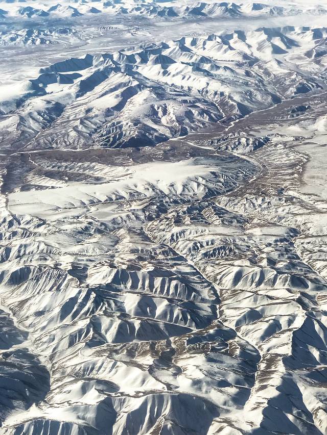 经过大概3小时的飞行,我被窗边的景象包围了,一幅活生生的油墨画呈现眼前,千沟万壑的大地,被白色的积雪点缀着,更显壮阔,一切都好像是精心准备的一份惊喜。