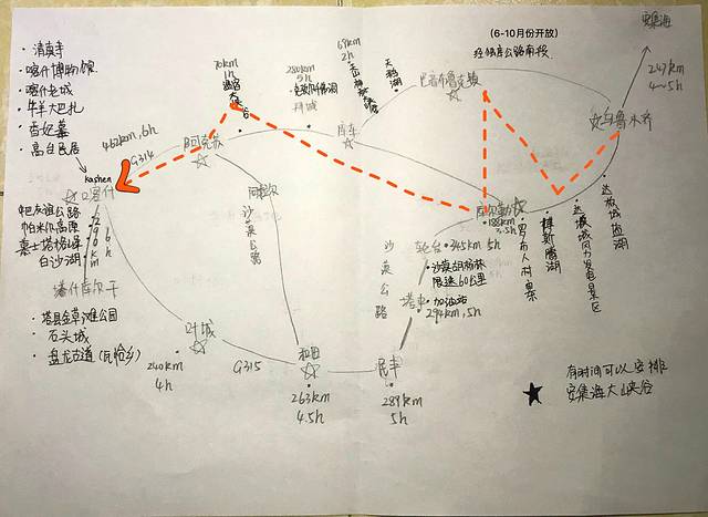 后半部分没有完成的行程,涵盖了大部分路上绝美景色:喀什古城--克州冰川公园--白沙湖--慕士塔格峰--塔县--盘龙古道--莎车--叶城--和田--民丰(沙漠公路)--轮台--乌鲁木齐,时间充裕必须18天以上会比较好,我们按原计划多出3天时间也不能全部完成这条线路。
